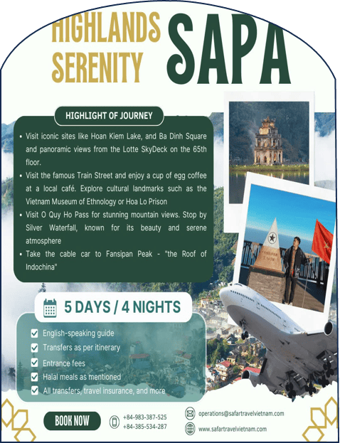 Experience the rich culture and natural beauty of Northern Vietnam. Begin in Hanoi, where ancient temples, colonial charm, and vibrant street food create a captivating city atmosphere. Stroll the historic Old Quarter and savour iconic dishes like pho and egg coffee. Then journey to the misty mountains of Sapa, home to stunning rice terraces, cascading waterfalls, and colorful ethnic minority villages. Discover breathtaking landscapes and local traditions, and take in panoramic views from Fansipan, the “Roof of Indochina.” A perfect blend of culture, cuisine, and highland adventure.